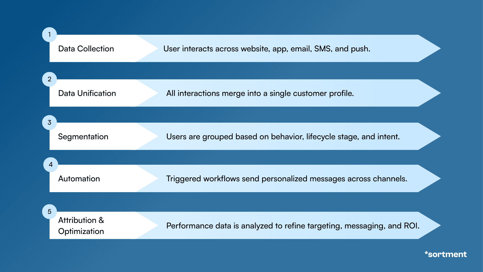 Sortment connects customer data from sources like data warehouses and orchestrates messaging across multiple channels - including email, SMS, push notifications, WhatsApp, in-app, and webhooks - all from one platform.