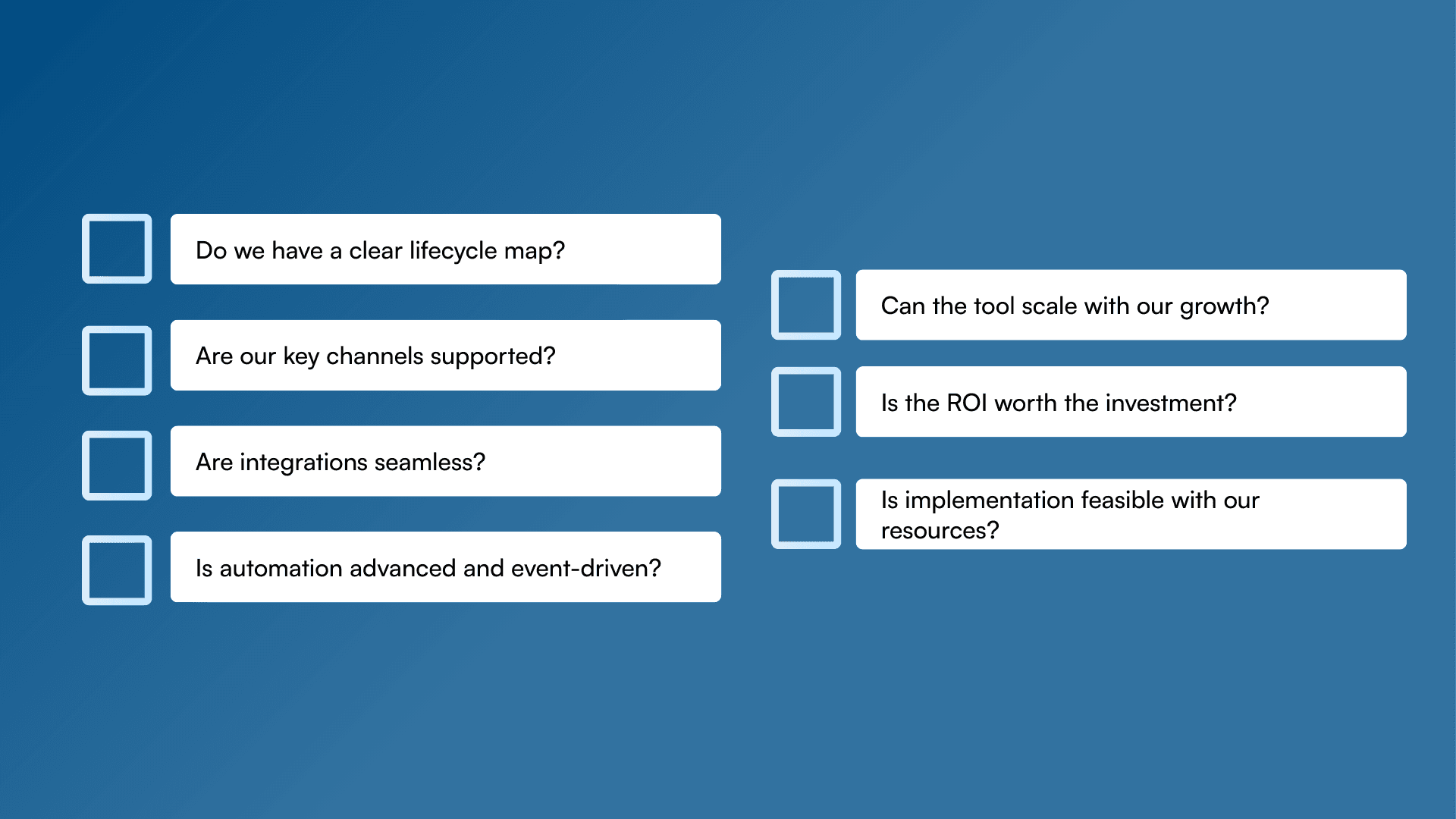 Choosing the right omnichannel marketing tool isn’t just about picking the one with the most features - it’s about finding the solution that aligns with your business goals, customer lifecycle, and growth priorities. Below is a practical guide to ensure you evaluate tools with both strategy and ROI in mind.