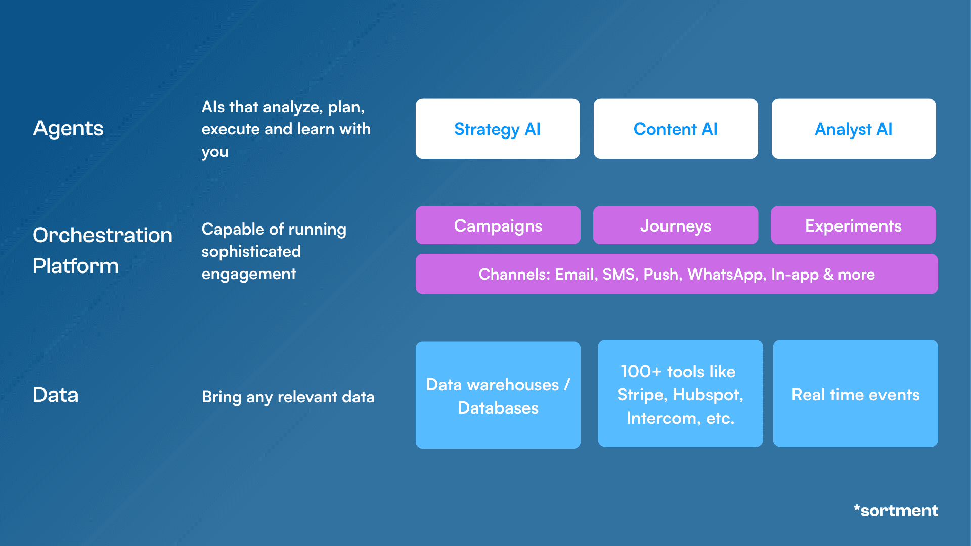 Instant integration, no migration, no downtime: Sortment plugs into your current tools and data sources without forcing a rip-and-replace. Whether you use another engagement platform, or homegrown stacks, onboarding is measured in days.